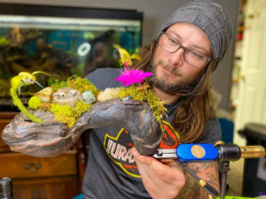 Avid fly angler Joe Jackson (AKA Sergeant Bass Fisher) is a prolific fly tyer best known for artistic masterpieces with deer hair, including his Baby Yoda, Hummingbird, and T-Rex. An Army vet, Jackson was deployed to Iraq and Afghanistan; after being medically retired with 14 years of service, Jackson discovered fly tying through Project Healing Waters Fly Fishing, where he found more therapeutic relief than he did in the therapist's chair. Jackson began tying flies in November 2016; by May 2017 his unique style had already garnered attention at an annual Project Healing Waters fly-tying event. Jackson tied in public for the first time at the International Fly-Tying Symposium in November 2017; meanwhile, his quirky art flies were creating a buzz on social media. Today Jackson is a pro-staffer for Partridge Hooks, Lidrig, Squimpish Flies, Nature's Spirit, Solarez, J.Stockard, Umpqua Feather Merchants, TFO, and Regal Vise. He spends most of his time tying flies, fishing, and volunteering with various veteran-focused nonprofits like Project Healing Waters and Guitars4Vets.